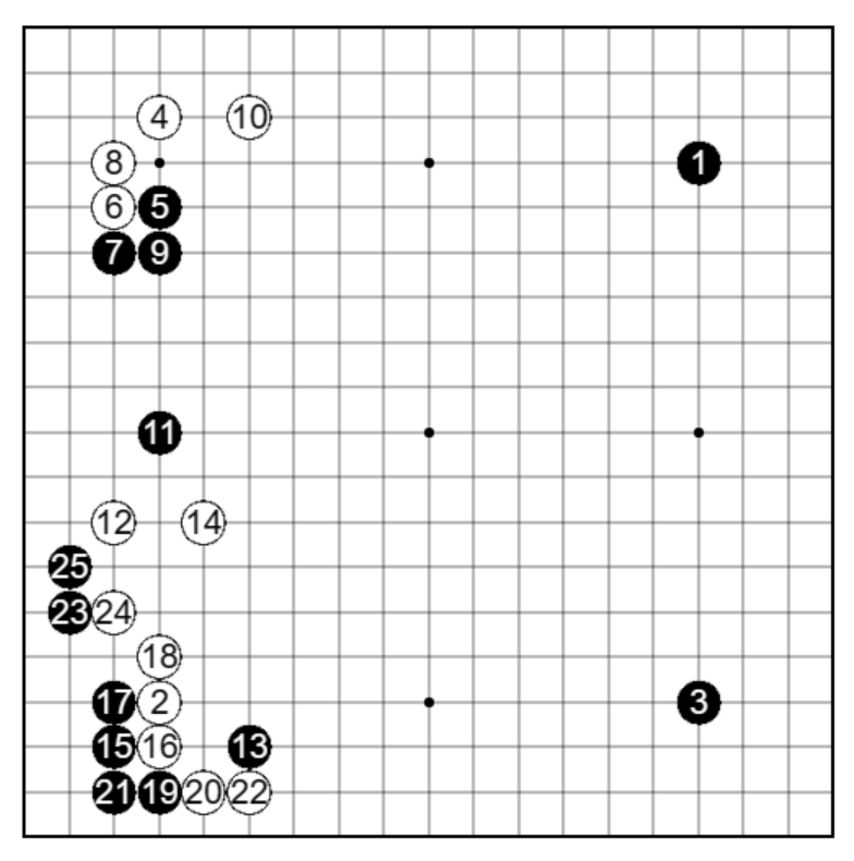 しかし、実戦は黒21だったため、白22と好形を築くことができました。