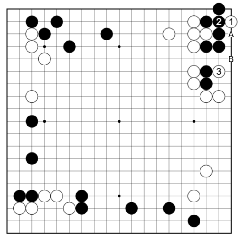 感想戦では黒83に代えて参考黒1でどうかという話になり、白Aなら黒2で黒勝てそうとなりました。しかし、それには白2と取るのが冷静で、どうしても黒は一手負けとなります。
