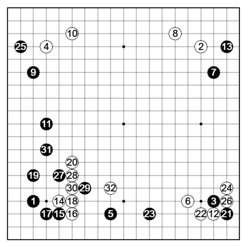 黒30自体は悪くない手のようですが、白31から形を崩されてしまいましたので下辺に一手入れたほうが下手としての態度としては適切だったかもしれません。