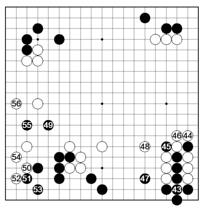 黒50に白51と下辺の黒に覆いかぶさりましたが、Bと大場に打つ方が冷静でしたか。