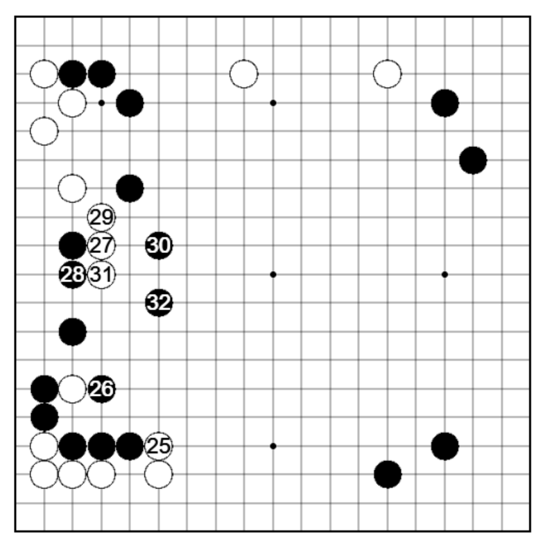 黒25は負けていれば敗着級のひどい手で、白28まで進むとこれは白大成功の図です。