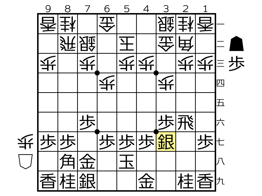 上図は▲3六歩で▲7五歩と変化したところ。