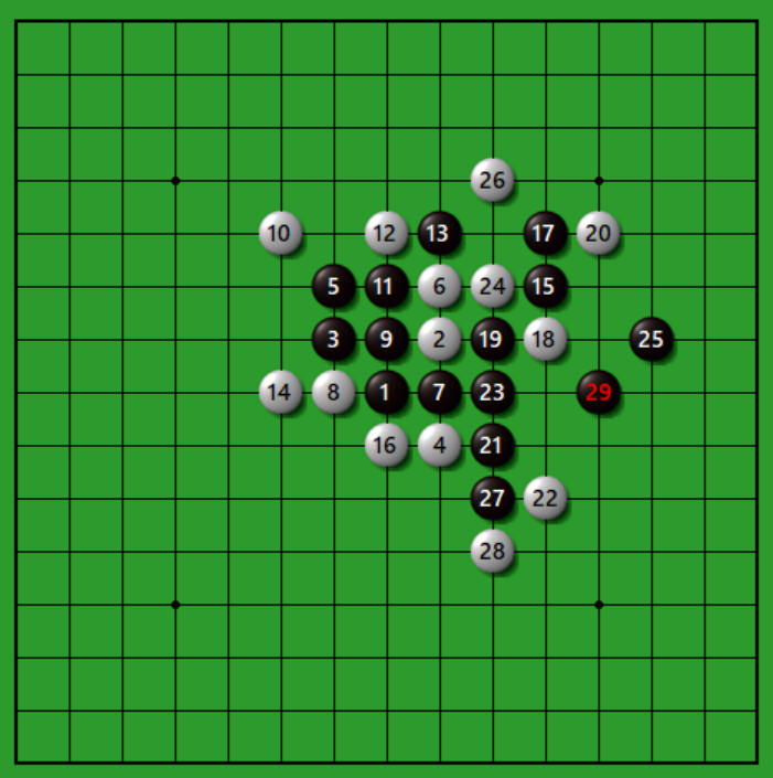 【連珠】浦月必勝手順の研究② 連珠 X Facebook はてブ LINE Pinterest コピー 2024.04.24 目次 テーマ図詰手順変化図 テーマ図 第1回では白12で13とした変化をみました。本譜は黒13と三を作って白がどちらに受けるか応手を聞きます。 詰手順 白14と下から受けてきた場合、13手で黒追い詰めとなります。 変化図 白14で上から押さえてきた場合、黒15が16の四三をみた好手。白16と防いでこられても、黒19まで3手で黒追い詰めとなります。 白16とカウンター含みで受けてこられても、黒は25の四三が見えていればなんということはありません。