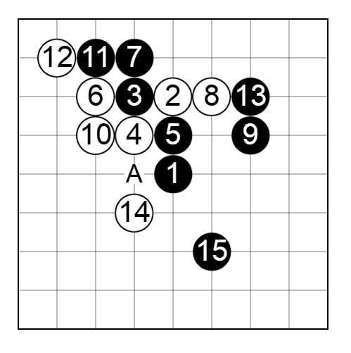白は12と「敵の打ちたいところへ打て」の格言に沿った手で対抗し、白14と逆に黒石を取りにいきます。