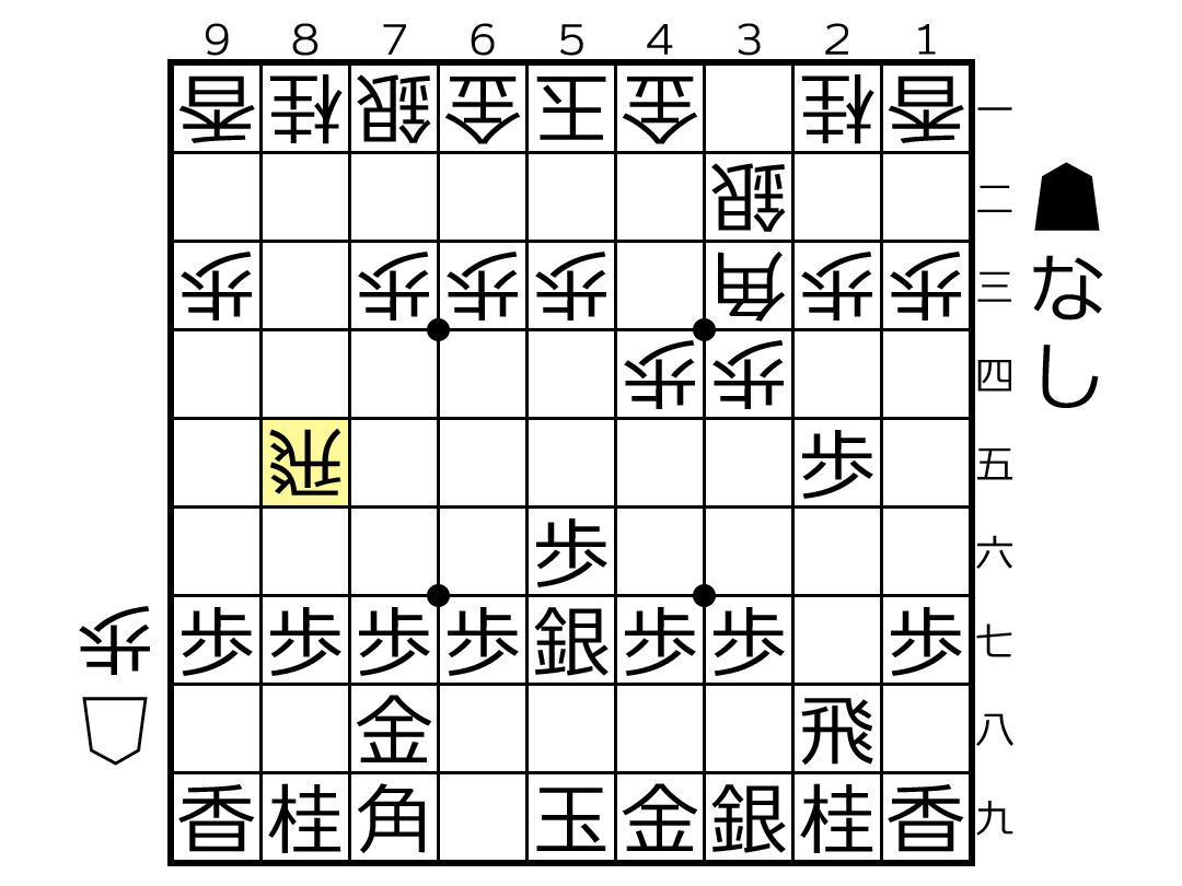 この▲5六歩型は大きく分けて2つのメリットがあります。①▲6六歩型と比べて6筋の歩が浮き駒にならない②▲4六角で攻めを牽制できる結論を先に言いますと、この本家推奨の指しかたなよって棒銀にも互角の戦いができます。▲5六歩以下△7四銀▲2六歩△6四歩▲5八金△7四銀で△9四歩には▲9六歩△8六歩▲同歩△同飛▲8八歩と嬉野流特有の受けで厳しい攻めはありません。△6四歩は6六の歩に働きかけていますが、気にせず▲5八金が意外にも有力です。