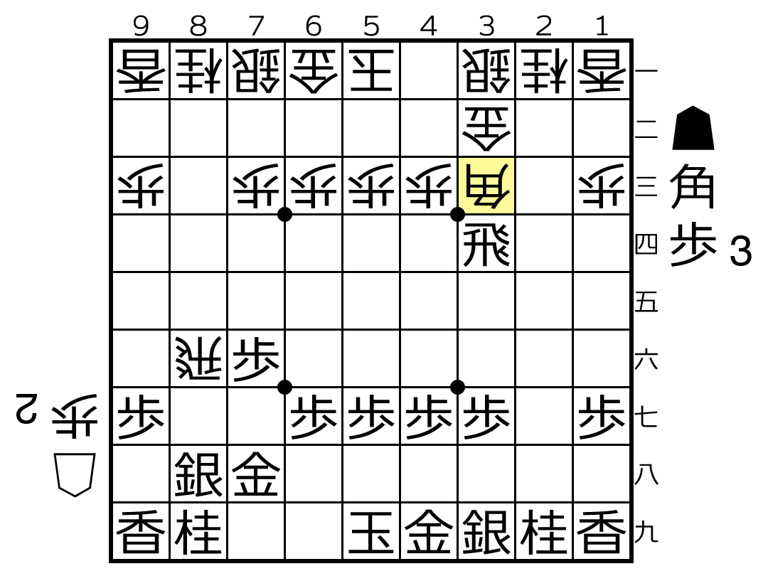 本譜は最も激しい変化で、△7四飛から飛車角を手持ちにする展開に。