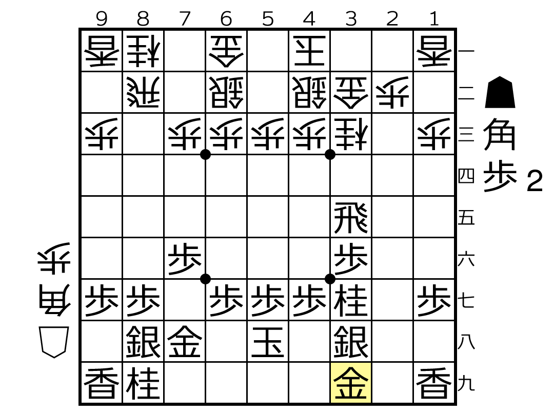 △8八角成 ▲同 銀 △3三桂▲2八歩