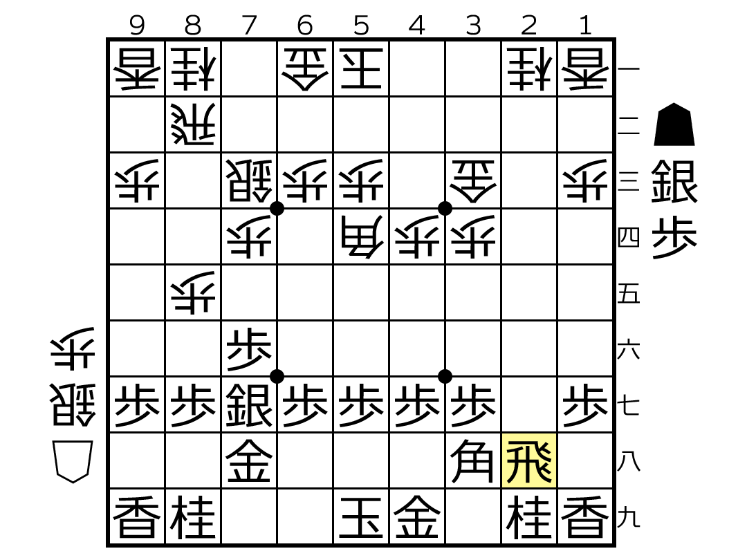▲2八飛△2二飛▲5五銀△3二角